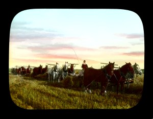 This photo is dated about 1904 and illustrates the machines replacing the historic scythe that reaped the standing grain. The Binder was so named as it would cut the crop and bind it with twine, into sheaves. Although each farmer would require a binder and team of horses, this photo has an early cooperative (Christian Communities Of Universal Brotherhood (CCUB)) working together to harvest. Later Binders were larger and required a team of four (4) horses. Much later, small tractors replaced the horses.